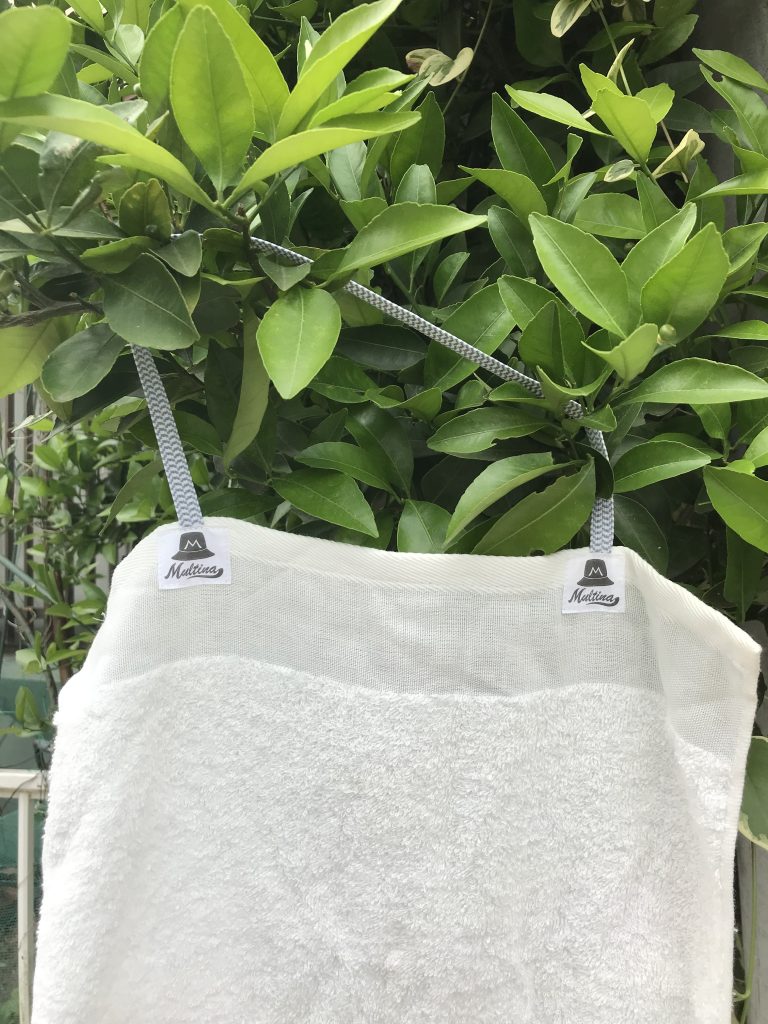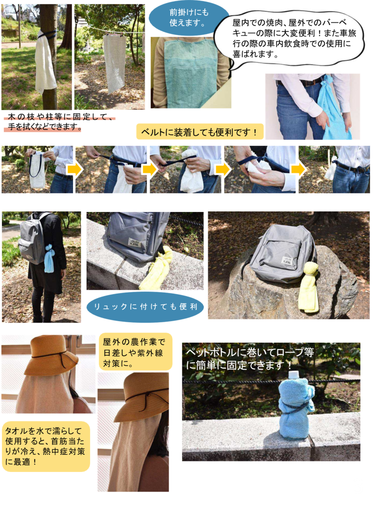 ハンガータオルとして、紐や小枝に掛けて風に吹かれて、飛ばない用に固定して使用。